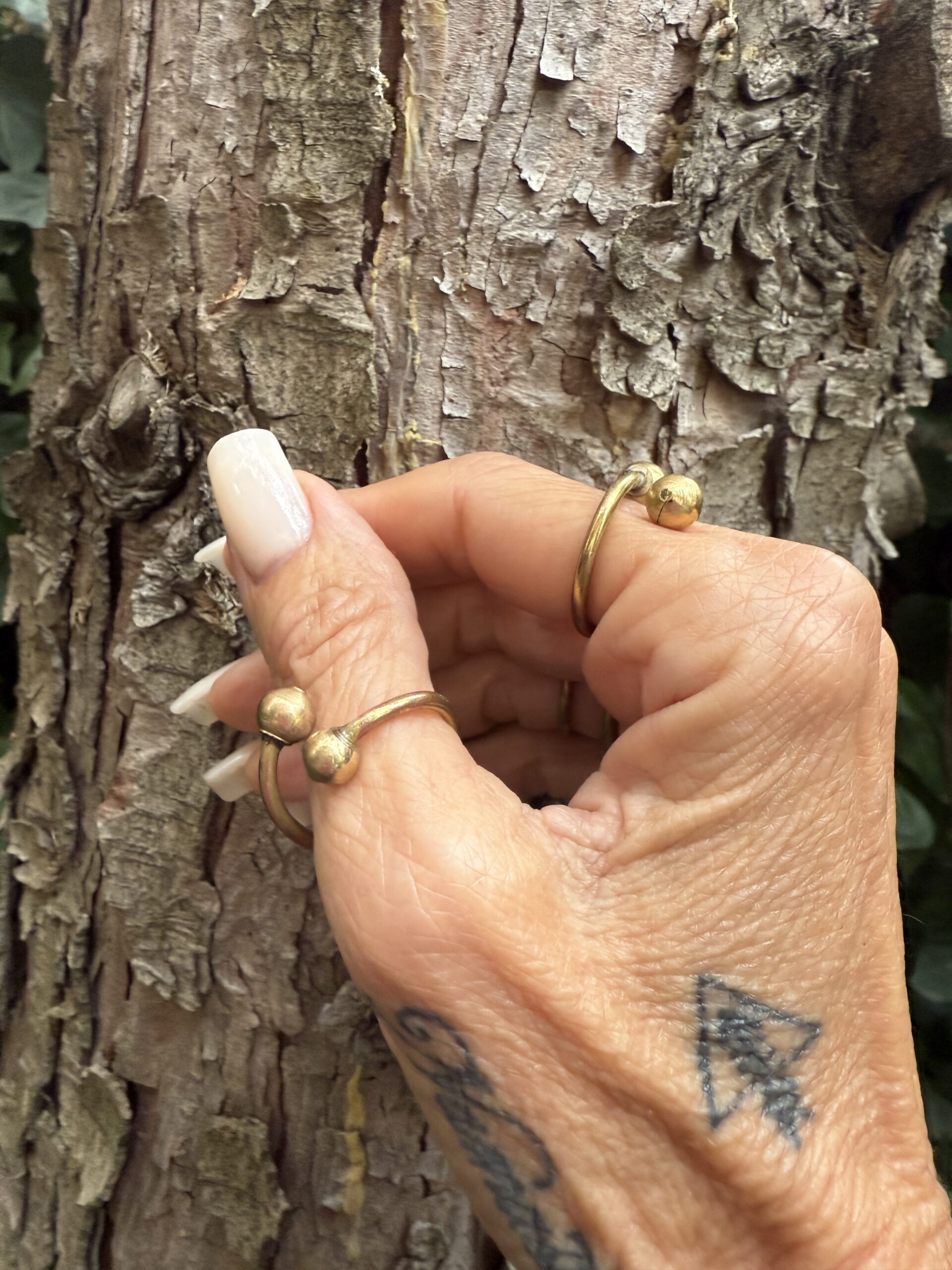 Las terminaciones redondeadas y la forma abierta ajustable le dan un aire muy orgánico, propio de los poblados nubios cercanos a Asuan. Recuerda a la simbología de los amuletos de energía dual. Son anillos que las mujeres nubias suelen llevar en grupo o combinados.